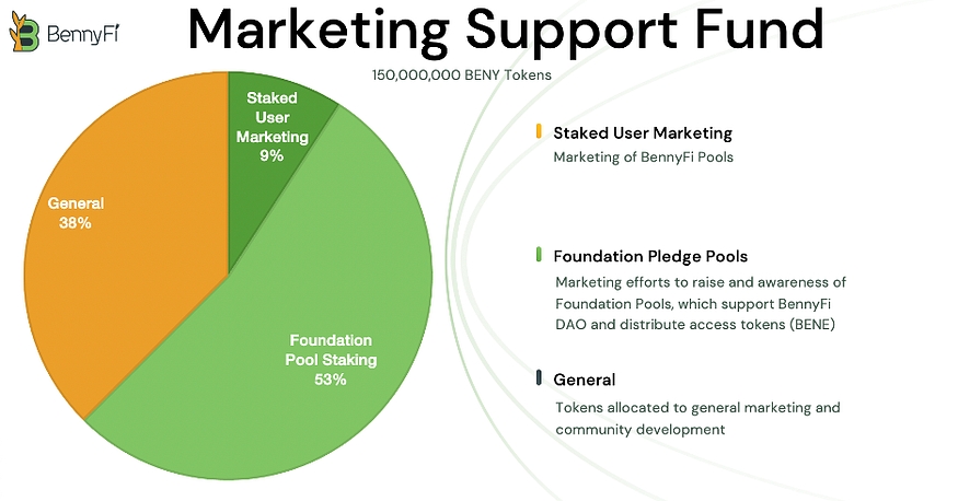 The Marketing Support Fund rewards Pool Managers meeting the Foundation’s marketing goals. Annually, the Foundation approves a budget that includes an allotment of BENY tokens to fund the Marketing Support Fund and a detailed description of the marketing goals the Foundation is willing to pay for. A new user bounty is a good example.